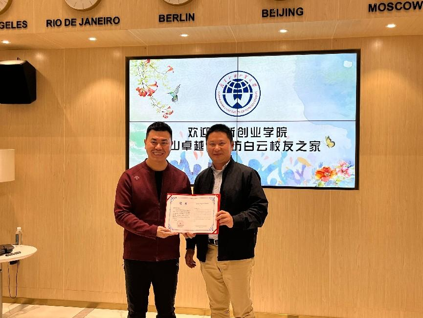 肖锋对郑会长的热情接待与精彩分享表示了衷心感谢,他强调,校友是母校的宝贵财富,希望校友与母校之间能继续保持密切联系,共同推动学校和校友事业发展。同时,肖锋也对云山卓越班全体同学提出希望,鼓励大家珍惜此次创业移动课堂的交流机会,将在此过程中学到的知识与经验切实运用到实践中去,拓展自身创新思维、有意识地培养自身创新意识,志存高远、勤奋学习、勇于创新。活动最后,肖锋代表广外创新创业学院,为郑壁奎校友颁发了创新创业导师聘书,标志着双方将在创新创业人才培养、项目孵化、创业实践等方面展开更深入的合作。