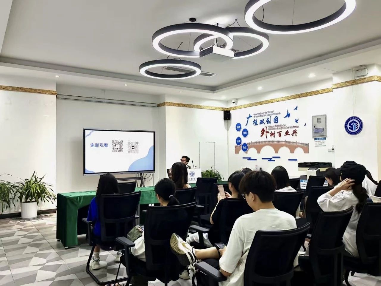"浪花"团队的主要负责人陈子贤为本次活动作专题讲座,深度分享了自身宝贵的参赛经验及创业实践历程中的感悟。过程中,陈子贤用直观可视化展示手法,系统介绍了创新创业赛事的相关要点,并针对备赛过程中的关键环节提出建议。在随后的交流环节,与会者围绕赛事特点、项目优化等话题展开探讨。分享过程中,陈子贤结合实践经历,强调了语言表达精准性与项目逻辑清晰性的重要性,并就创业方向选择、产品设计思路等给出了实用建议。