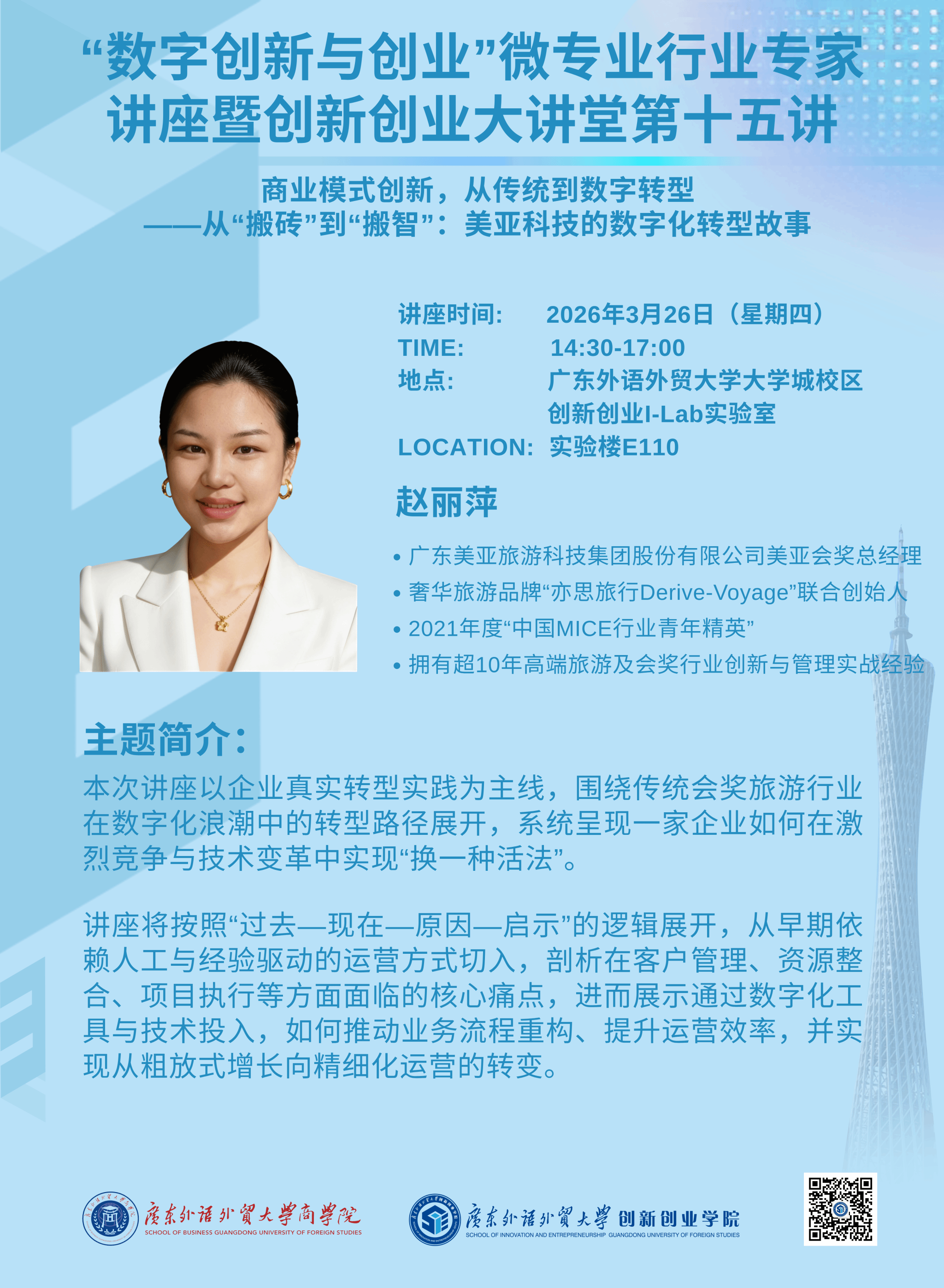 特邀广东美亚旅游科技集团股份有限公司美亚会奖总经理赵丽萍 ,以企业真实转型实践为主线 ,系统地呈现传统会奖旅游行业在数字化浪潮中的转型路径。讲座将按照“过去—现在—原因—启示”的逻辑,从早期依赖人工与经验驱动的运营方式切入,剖析客户管理、资源整合、项目执行等方面的核心点,进而展示如何通过数字化工具与技术投入推动业务流程重构、提升运营效率,实现从粗放式增长向精细化运营的转变。满满行业干货,帮你提前对接数字化转型下的用人需求与职业新机遇!